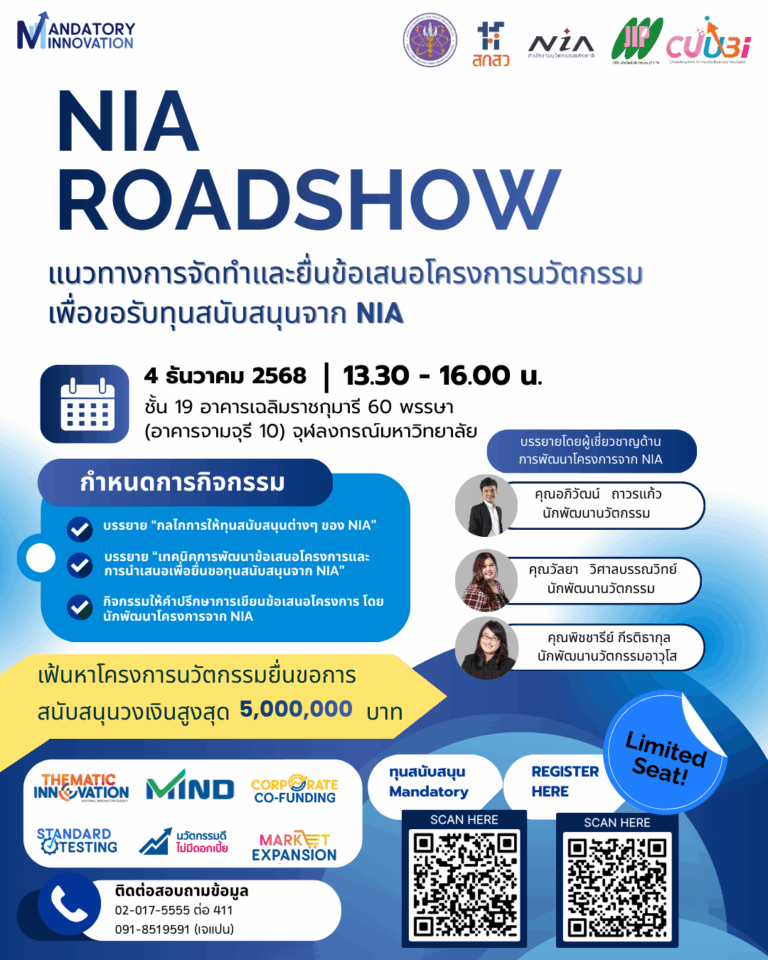 โอกาสสำคัญที่ไม่ควรพลาด! กิจกรรม NIA Roadshow : แนวทางการจัดทำและยื่นข้อเสนอโครงการนวัตกรรมเพื่อขอรับทุนสนับสนุนจาก NIA
