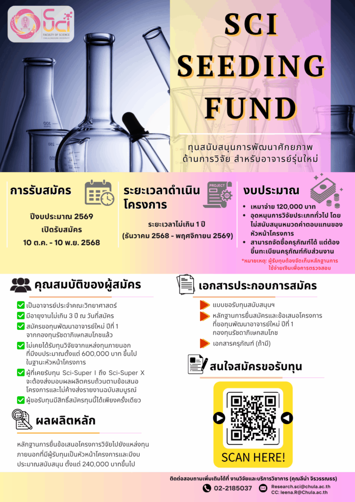 คณะวิทยาศาสตร์ จุฬาฯ ขอแสดงความยินดีกับคณาจารย์ที่ได้รับการสนับสนุนทุนวิจัยและนวัตกรรม จากสำนักงานการวิจัยแห่งชาติ (วช.) ประจำปีงบประมาณ 2568ธันวาคม 27, 2024