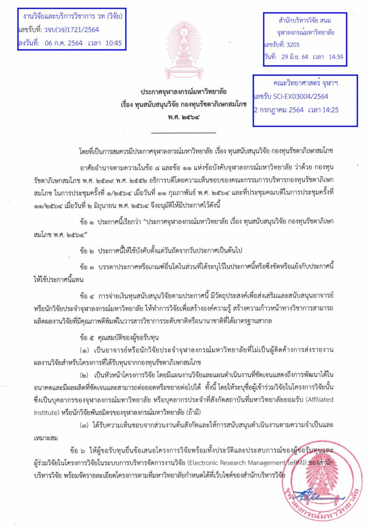 ประกาศจุฬาลงกรณ์มหาวิทยาลัย เรื่อง ทุนสนับสนุนวิจัย กองทุนรัชดาภิเษกสมโภช พ.ศ.2564