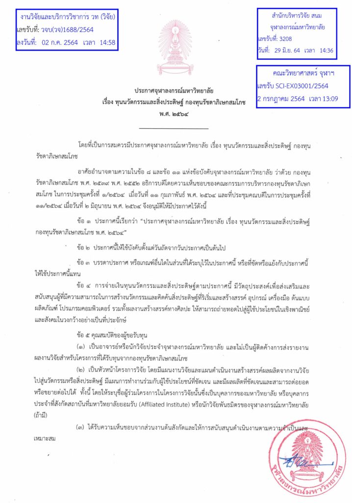 ประกาศจุฬาลงกรณ์มหาวิทยาลัย เรื่อง ทุนนวัตกรรมและสิ่งประดิษฐ์ กองทุนรัชดาภิเษกสมโภช พ.ศ.2564