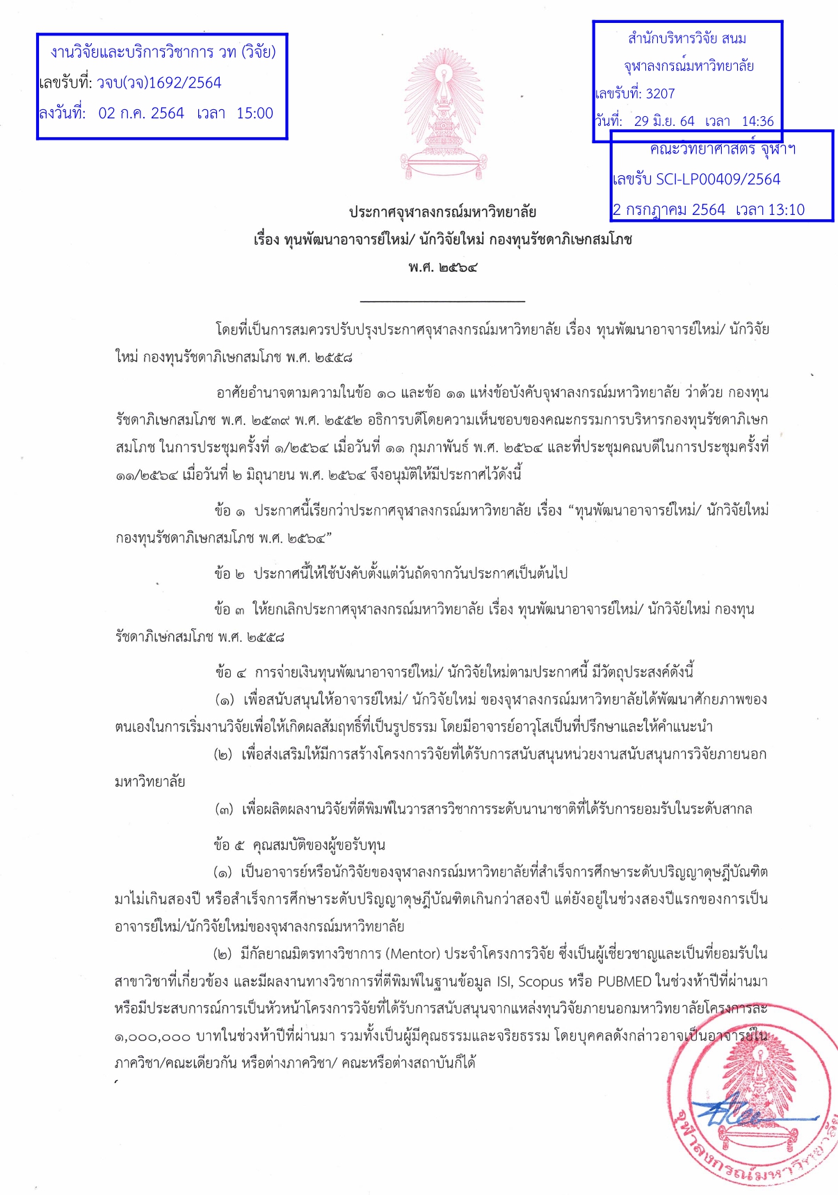 ประกาศจุฬาลงกรณ์ เรื่อง ทุนพัฒนาอาจารย์ใหม่/นักวิจัยใหม่ กองทุนรัชดาภิเษกสมโภช พ.ศ.2564